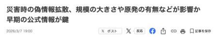 災害時の偽情報拡散、規模の大きさや原発の有無などが影響か 早期の公式情報が鍵