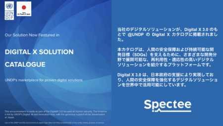 レジリエンス・テック・スタートアップの株式会社Spectee(本社:東京都千代田区、代表取締役:村上建治郎、以下「Spectee」)は、当社のAIリアルタイム防災・危機管理サービス『Spectee Pro』が、国連開発計画(UNDP)のDigital X 3.0プロジェクトのもと、「Digital X カタログ」に掲載されたことをお知らせします。