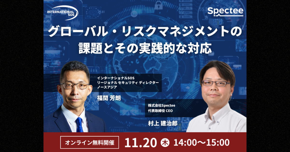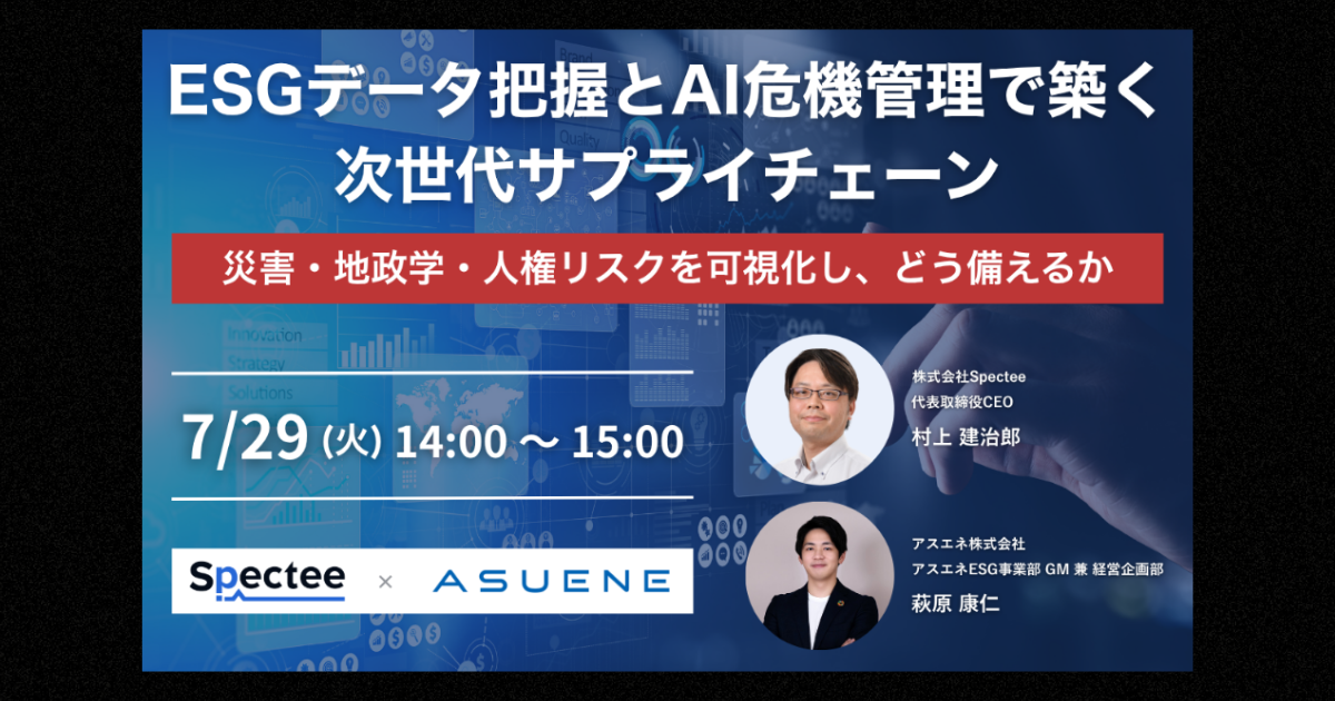 また、『Spectee SCR』(https://spectee.co.jp/service/specteescr/)はサプライチェーンに影響を与える危機を瞬時に可視化し、SNS・気象データ・地政学リスク情報など様々な情報をもとに、インシデント発生による危機をリアルタイムで覚知し、生産への影響や納期の遅れ等を迅速に把握することができます。