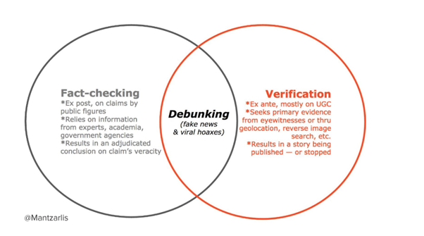 そのため、ここでは便宜的にファクトチェックの定義を論じる際にしばしば引用される下記の図を用いて解説します。この図を作成したのは世界のファクトチェック団体でつくるIFCN (International Fact-Checking Network) の事務局長を務めたAlexios Mantzarlis氏で、ファクトチェック (Fact-cheking)に加え、同種の行為であるVerification、Debunkingという行為の概念を示しました。