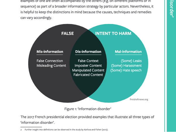 左側の円のMis-information (誤情報)は、間違いがあるが害を与える意図はない情報。右側のMal-informationは、間違いはないものの害を与える意図がある情報。そして、両者の共通部分にあたるDis-information (偽情報)は、間違いもあり害を与える意図がある情報となります。日本では、偽情報と誤情報はしばしば混同されて使用されることが見受けられますが、このように明確な区分が存在しています。