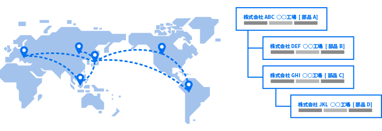サプライヤー拠点や製品のつながりをマップやツリー構造で画面上で可視化。一元管理することでサプライチェーンの全体像を把握することができます。