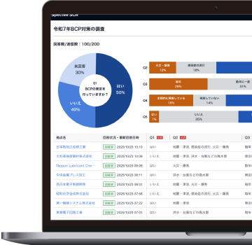 平時の際にサプライヤーにサーベイ機能で聞き取りを行い、有事の際の生産活動への影響を把握し、その後の予測・的確な対応が可能になります。